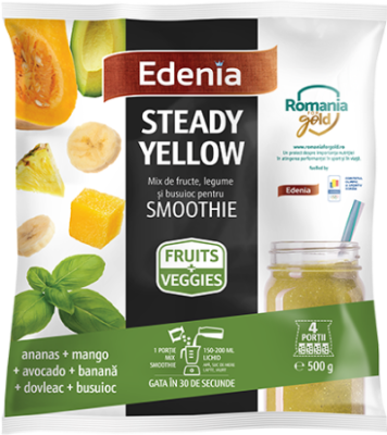 Cu Edenia Smoothie Steady Yellow iti iei simplu si rapid o doza de vitamine in forma lor naturala, direct din fructe, legume si plante aromatice proaspete, congelate rapid. Mixul echilibrat dintre ananas, mango, avocado, banana, dovleac si busuioc, combinat in portii ideale de catre specialisti, ajuta la mentinerea unei stari psihice bune, pentru a fi gata sa infrunti orice obstacol, si in viata si in sport.